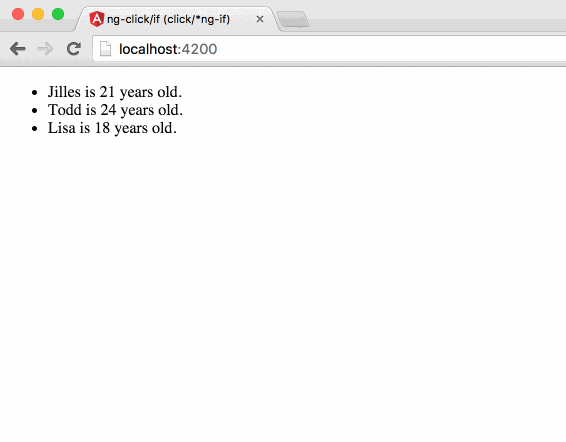 I appended a div to our application with the ngIf directive. It will only show the div if a ctrl.currentPerson is set. We set ctrl.currentPerson after clicking on a list item (with the ng-click directive). Now it’s time to do this in Angular2.