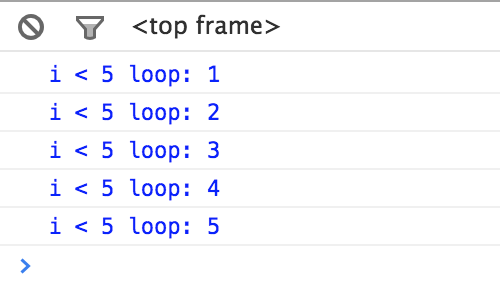for (let i = 0; i < 5; i++) { console.count('i < 5 loop');}Would output: