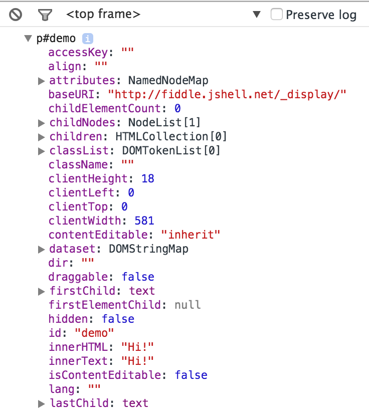 console.dir(document.querySelector('p#demo'));This will give you: