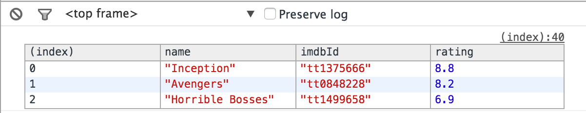 What’s nice is that you can also specify an array of keys to display. so console.table(movies, ['name', 'rating']); would show: