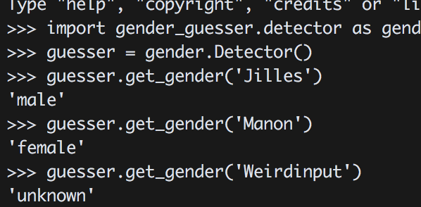 One of the things I love about Python is PyPi. I guess you can compare it to NPM for Node. I found a great library called “gender-guesser”. After downloading it I tested it quickly using the Python REPL. If it recognised my rather uncommon name as male I would be sold.