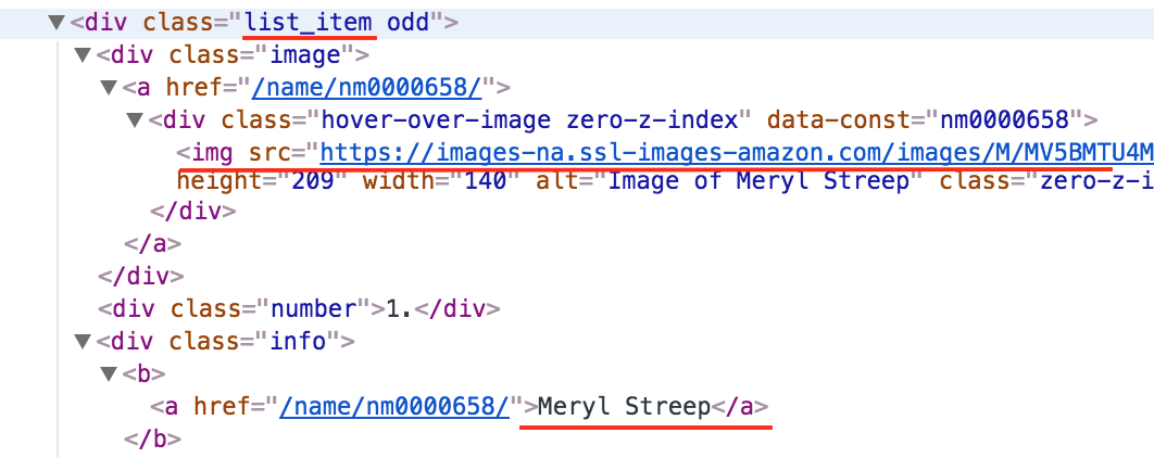 def fetch_data_and_populate(imdb_list_url, gender): html = request.urlopen(imdb_list_url).read() soup = BeautifulSoup(html, 'html.parser') # A list with BeautifulSoup items to iterate over actor_items = soup.findAll('div', {'class': 'list_item'}) new_actors = [] for actor in actor_items: # Finds .list_item b a and its content name = actor.b.a.text # Finds .list_item's img tag and its source img_url = actor.img['src'] # Create a new Actor object new_actors.append(Actor(name=name, img_url=img_url, gender=gender))