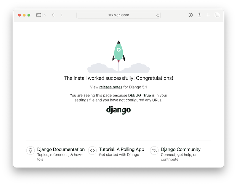 $ poetry shellSpawning shell within ...$ python manage.py migrateOperations to perform: Apply all migrations: admin, auth, contenttypes, sessionsRunning migrations: Applying contenttypes.0001_initial... OK ...$ python manage.py runserverDjango version 5.1, using settings 'my_project.settings'Starting development server at http://127.0.0.1:8000/Quit the server with CONTROL-C.