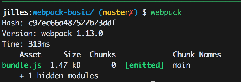 module.exports = { entry: './app/src/index.js', output: { path: './public', filename: 'bundle.js' }};It really is a simple object containing specifying input (entry) and output. We can now run webpack from our console and it will build.